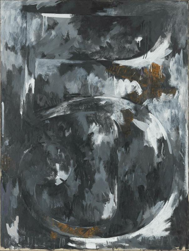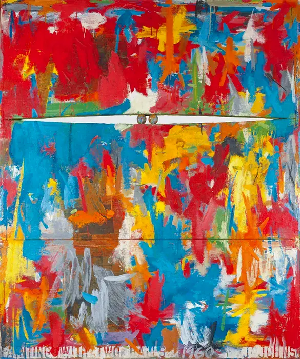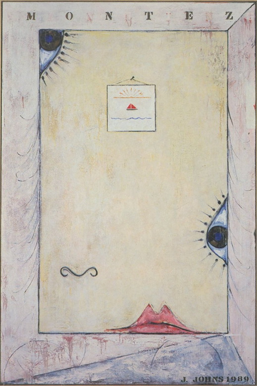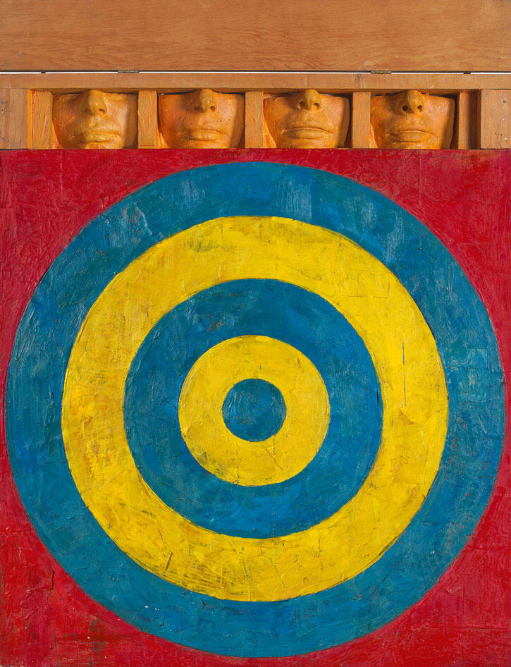 Issu de l’Expressionnisme abstrait, Jasper Johns prend en 1955 des objets pour «faire autre chose avec». Il figure des drapeaux américains et des cibles, des objets plats, géométriques et symboliques et confond image et support (Drapeau, 1955). En 1959, il ajoute lettres et chiffres à ses toiles, opposant les deux signifiants – l’écriture, la peinture (Faux Départ, 1959). Il est, dans les années soixante, l’un des initiateurs du Pop Art. Il peint très soigneusement, afin de reproduire parfaitement le modèle, des moulages en bronze et des sculptures en papier mâché d’objets du quotidien [Boîtes de bière, 1964). Il fixe des ustensiles sur ses toiles et compose des natures mortes autobiographiques. À la fin des années soixante, ses peintures à la cire ne sont plus que hachures, espaces compartimentés, étoiles diffractées. La figure ne réapparaît qu’au début des années quatre-vingt, partiellement d’abord avec les Tantriques puis sereinement avec la série des Saisons. Dans les années quatre-vingt-dix, il mêle figuration et abstraction, entrelace les formes et rend parfois hommage aux maîtres du passé (D’après Holbein, 1993). Il se consacre également à la gravure en couleur (Green Angel, 1997).