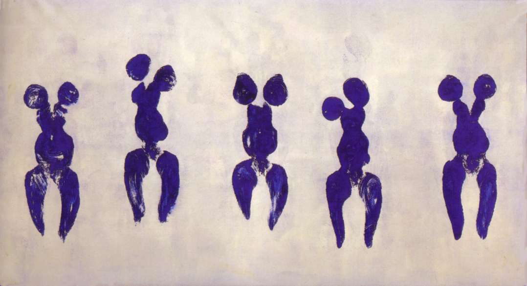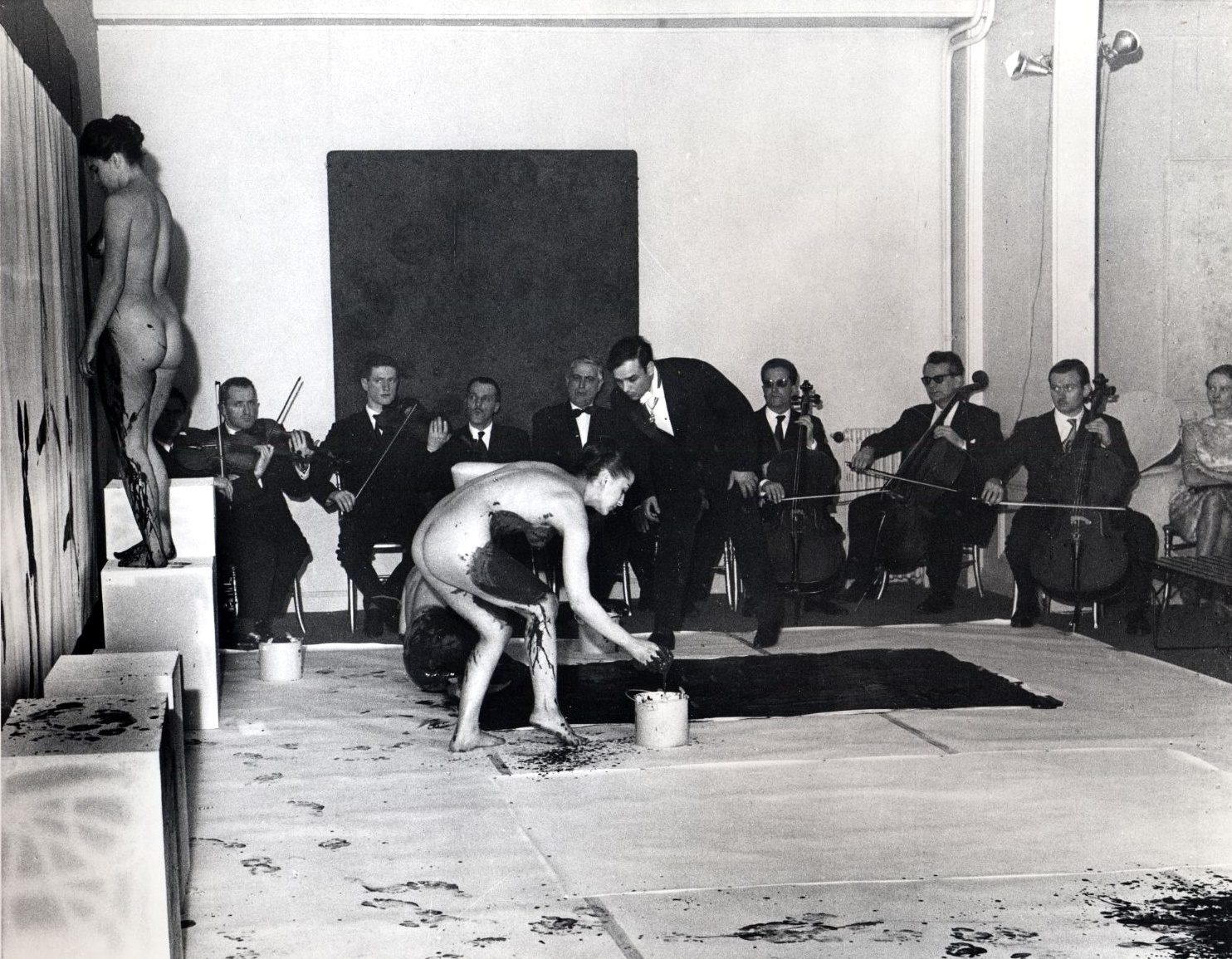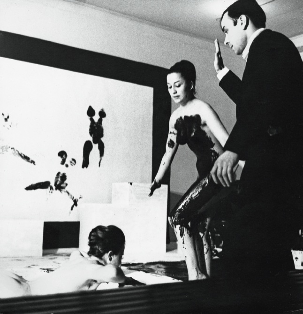 Le 5 juin 1958, il organise dans l'appartement de l'île saint-Louis de Robert J. Godet sa première expérience en public de « pinceaux vivants ». Devant une quarantaine d'invités, Marlène, une jeune modèle entièrement enduite de bleu, se roule sur du papier blanc et y dépose un bleu monochrome issue de ses empreintes corporelles.