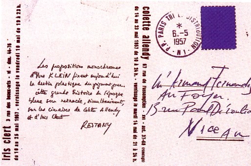 Elle est suivie, en mai 1957, par une double exposition à Paris, d'une part à la Galerie Iris Clert, « Yves, Propositions monochromes », du 10 au 25 mai, d'autre part à la Galerie Colette Allendy, « Pigment pur », du 14 au 23 mai46. Le 10 mai, devant la galerie Iris Clert, il lâche mille et un ballons bleus gonflés à l'hélium, sa « première sculpture aérostatique ». Le 14 mai, Klein présente sa première peinture de feu, Feux de Bengale - tableau de feu bleu d'une minute (M41), dans le jardin de la galerie Colette Allendy, et au premier étage, son premier Immatériel, une salle entièrement vide intitulée Espaces et volumes de la sensibilité picturale immatérielle wikipedia)