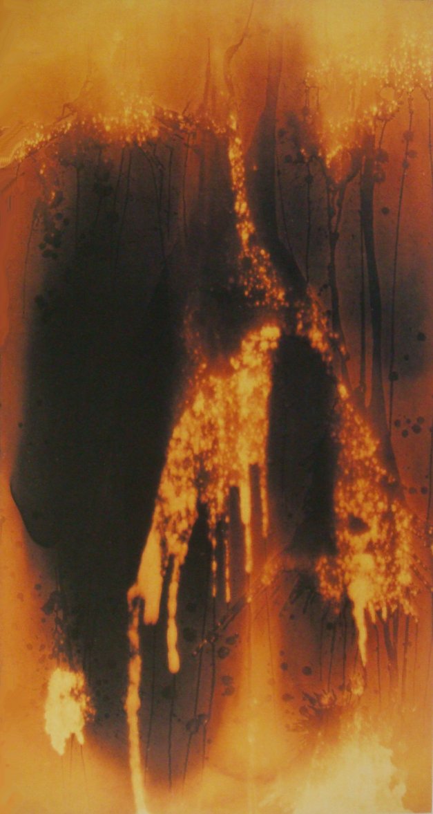 La fièvre créatrice d’Yves Klein est sans limite, et il ne se contente pas d’explorer la couleur ou le vide. Profondément marqué par des photographies d’Hiroshima, sur lesquelles on devine les empreintes des corps des victimes, Yves Klein initie sa série Peinture de feu au début de l’année 1961 : il y cherche à imprimer les traces du feu sur divers supports. C’est au Centre d’essais de Gaz de France de la Plaine Saint-Denis, où on met à sa disposition un équipement industriel, qu’il apprend à maîtriser le feu et à effectuer des réglages précis pour en utiliser les différents degrés de puissance. Il réalise ainsi, encadré par des pompiers, des tableaux « peints » au lance-flamme. Après le corps féminin, c’est le feu qui lui sert de pinceau dans sa quête vers l’exploration de l’immatérialité.