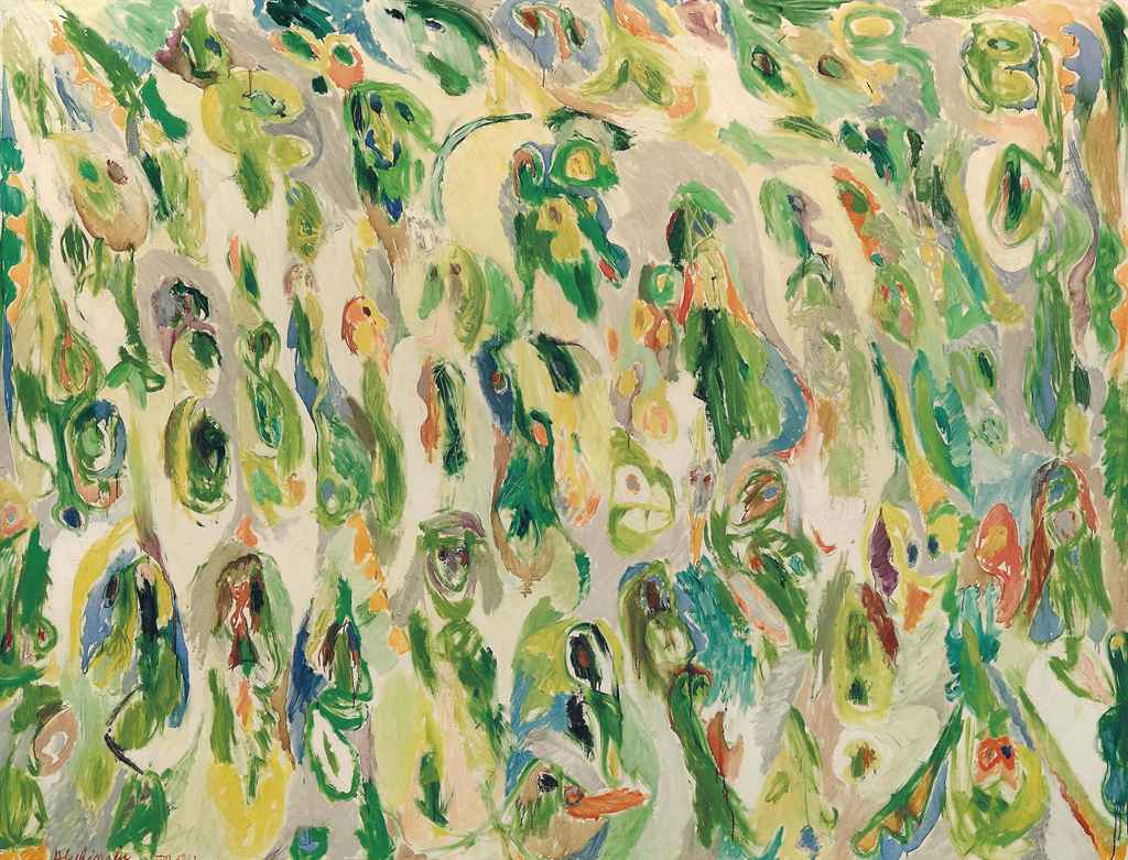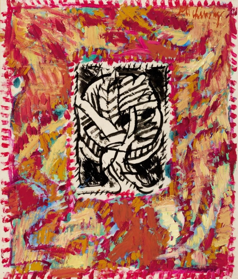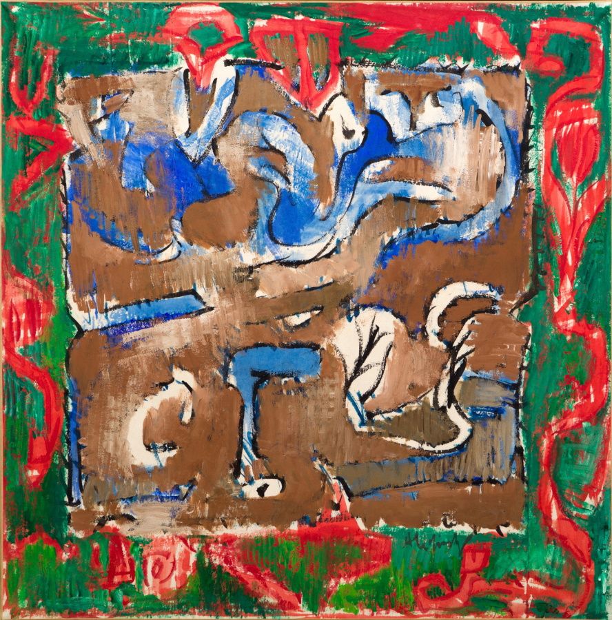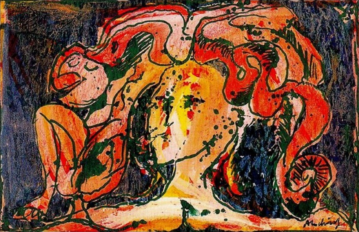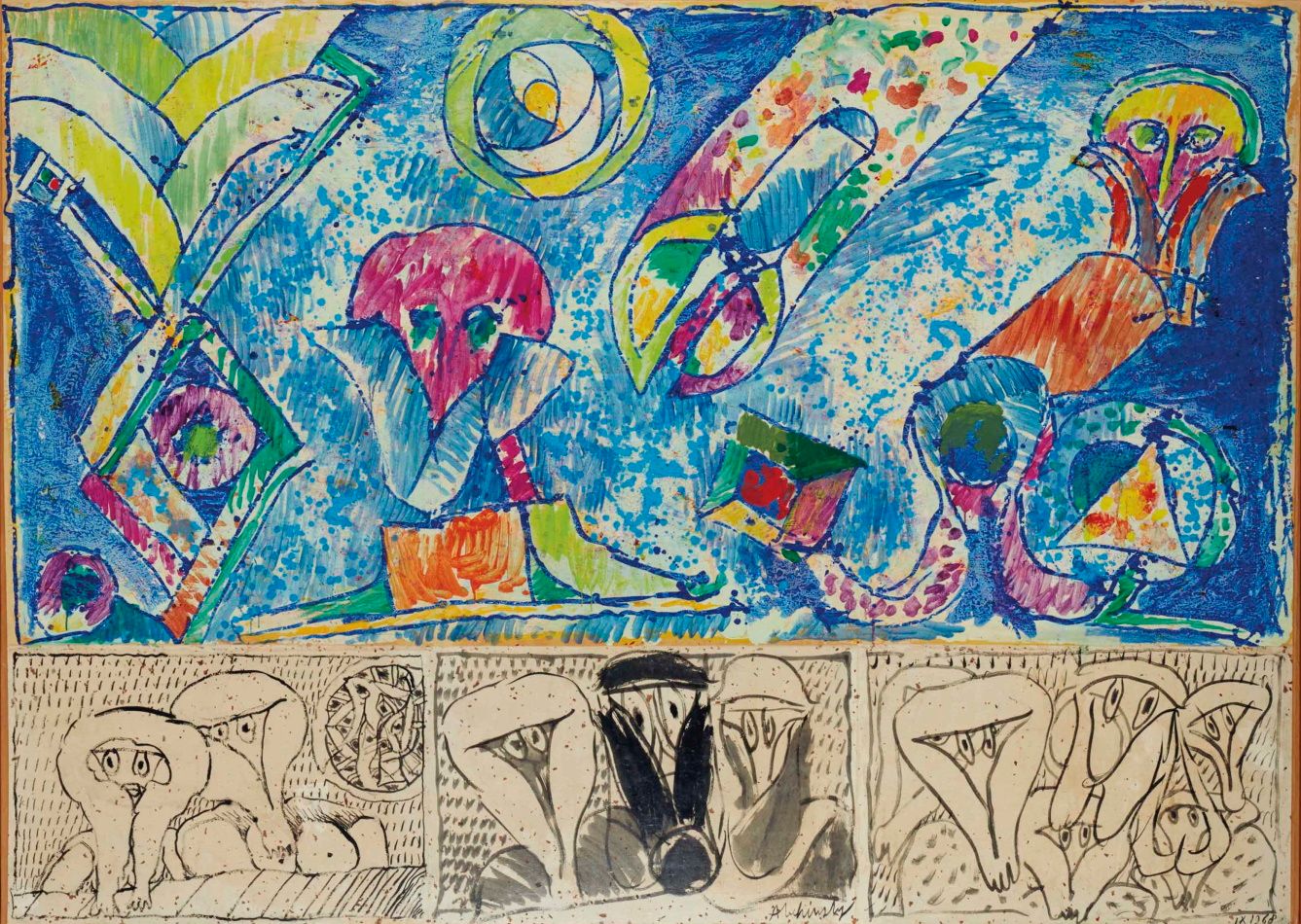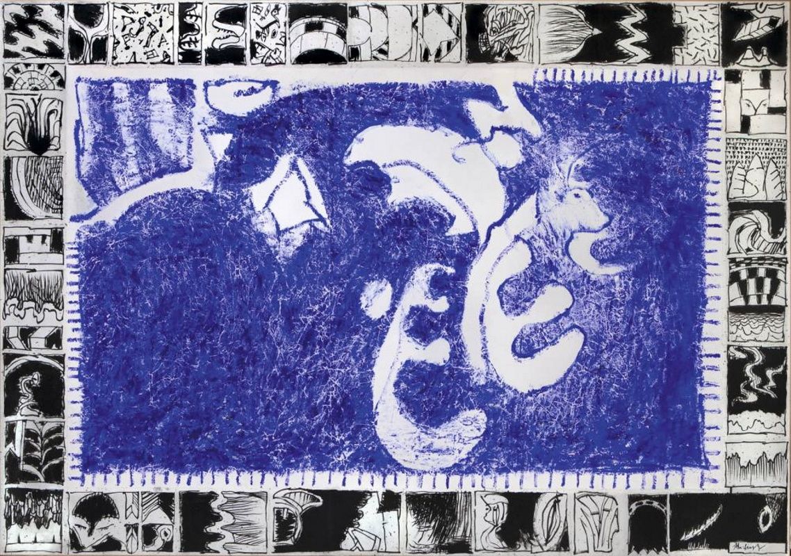 Sous son pinceau agile, diverses arabesques se déploient, donnant naissance à des lutins, des sauriens improbables, volcans éclatants de couleur et torrents – un bestiaire et une géographie suscitant aussi bien l’inquiétude que le sourire de connivence, tout un univers de formes et d’entrelacs.