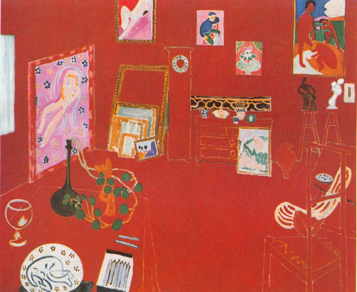 Henri MATISSE 1911 "l'Atelier rouge" ( l'aplat rouge aplatit la profondeur, annule la différence sol /murs )