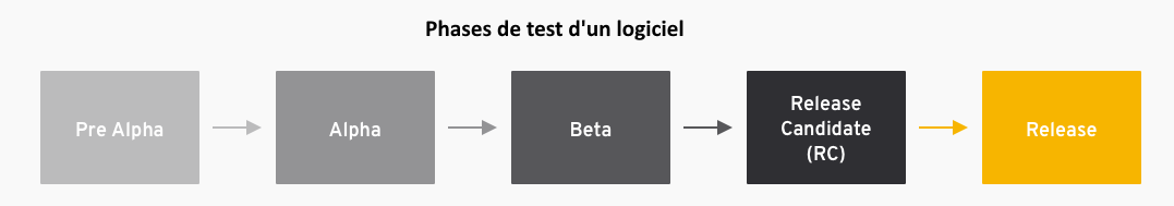 - Lors de la réalisation d'un logiciel ou d'une nouvelle version de celui ci, la phase de création ( dite phase de développement) est nommée version alpha, vient ensuite une version Beta du logiciel qui est une version d'essai proposée au public qui permet de corriger les défauts , par retour des avis des utilisateurs, sur les problèmes rencontrés ( bugs), suivra une réalisation "candidate" presque définitive qui précèdera la version finale commercialisable.