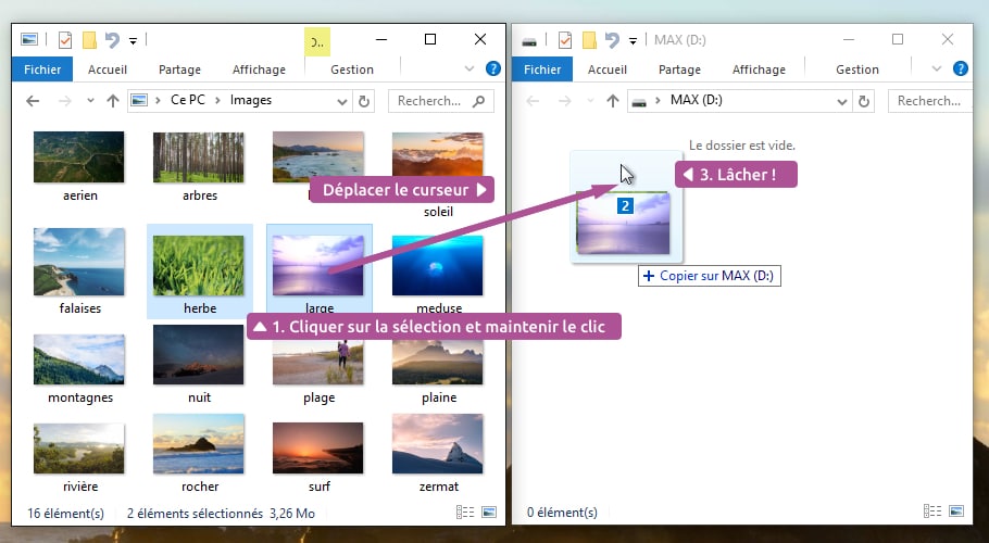 Action par laquelle l’utilisateur sélectionne un objet à l’écran et, tout en maintenant le clic gauche enfoncé, le déplace jusqu’à une autre position, puis le lâche pour déclencher une action sur cet objet (le modifier, le déplacer, le copier, etc.).