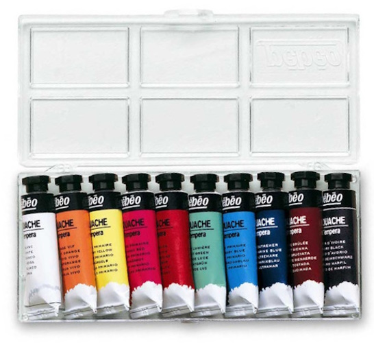 - : Peinture à l’eau qui se présente sous forme liquide, pâteuse (en pots ou tubes) ou solide (en pastilles).