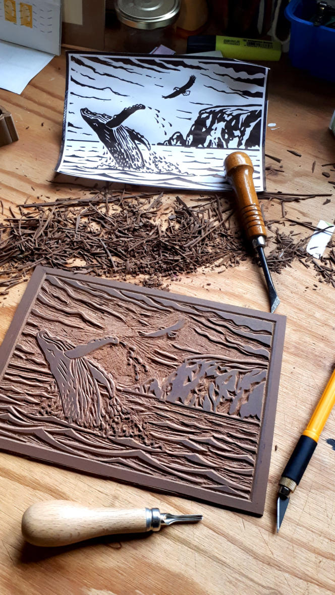 - procédé de gravure directe sur linoléum, creusé par des gouges en acier en V ou en U (ce qui créer un master négatif) ; cette matière semi-molle est préférée à la gravure sur bois par sa facilité.