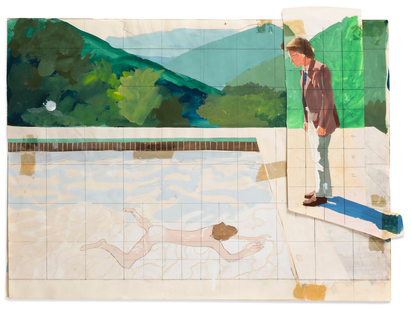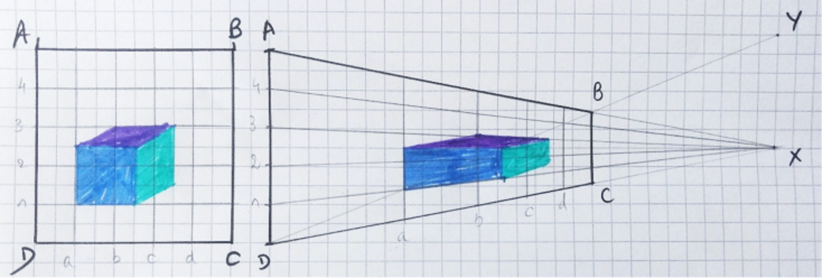 Le dessinateur marque le travail original de lignes perpendiculaires qui forment des carreaux égaux et prépare le nouveau support de la même manière. Il repère ensuite les lignes principales de chaque carreau par rapport à ses bords1.