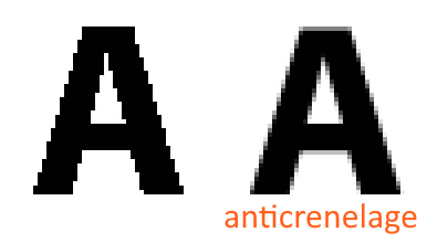 - Fonction qui réduit et adoucit le crénelage d'une image en lui ajoutant du flou de contour, pour la rendre moins dentelée à l'œil. (voir : crénelage)