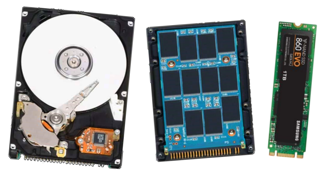 Périphérique de stockage . Il contient des partitions qui sont formatées, dans lesquelles sont installés : 1) Le Système d'exploitation, 2) les Logiciels , 3) les Dossiers et les Fichiers. ci contre, divers disques durs selon leur évolution technique : le disque dur à plateaux tournat à 5400 tours ou 7200tours avec un bras de lecture (HDD), le disque dur SSD composé de blocs mémoire Flash, et les recents disques durs NVMe ou M2 guère plus gros qu'une barette de mémoire